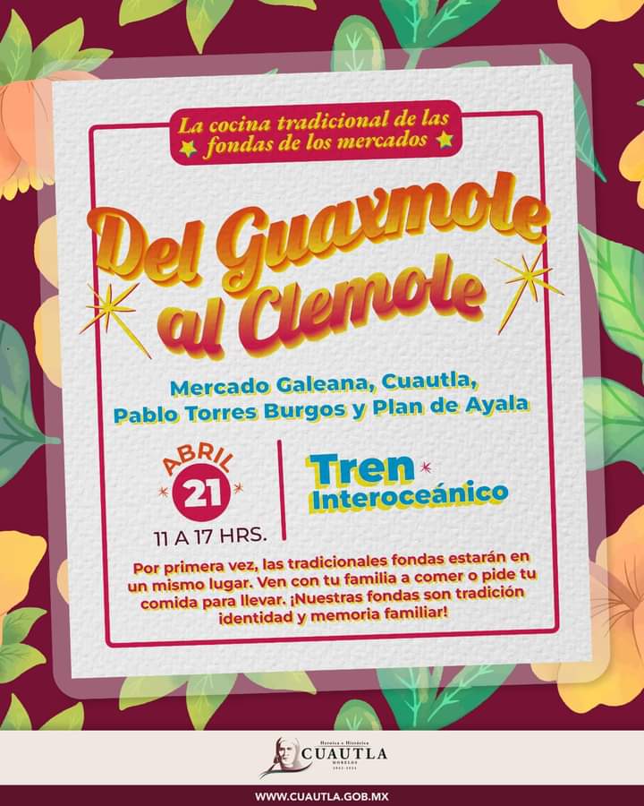 A fin de dar la importancia gastronómica que tienen las fondas y cocinas económicas de los mercados de la ciudad, el ayuntamiento de Cuautla, a través de la dirección municipal del patrimonio cultural, anunció la realización del festival gastronómico “Del Guaxmole al Clemole”, mismo que se realizará el próximo 21 de abril en los patios del tren escénico.