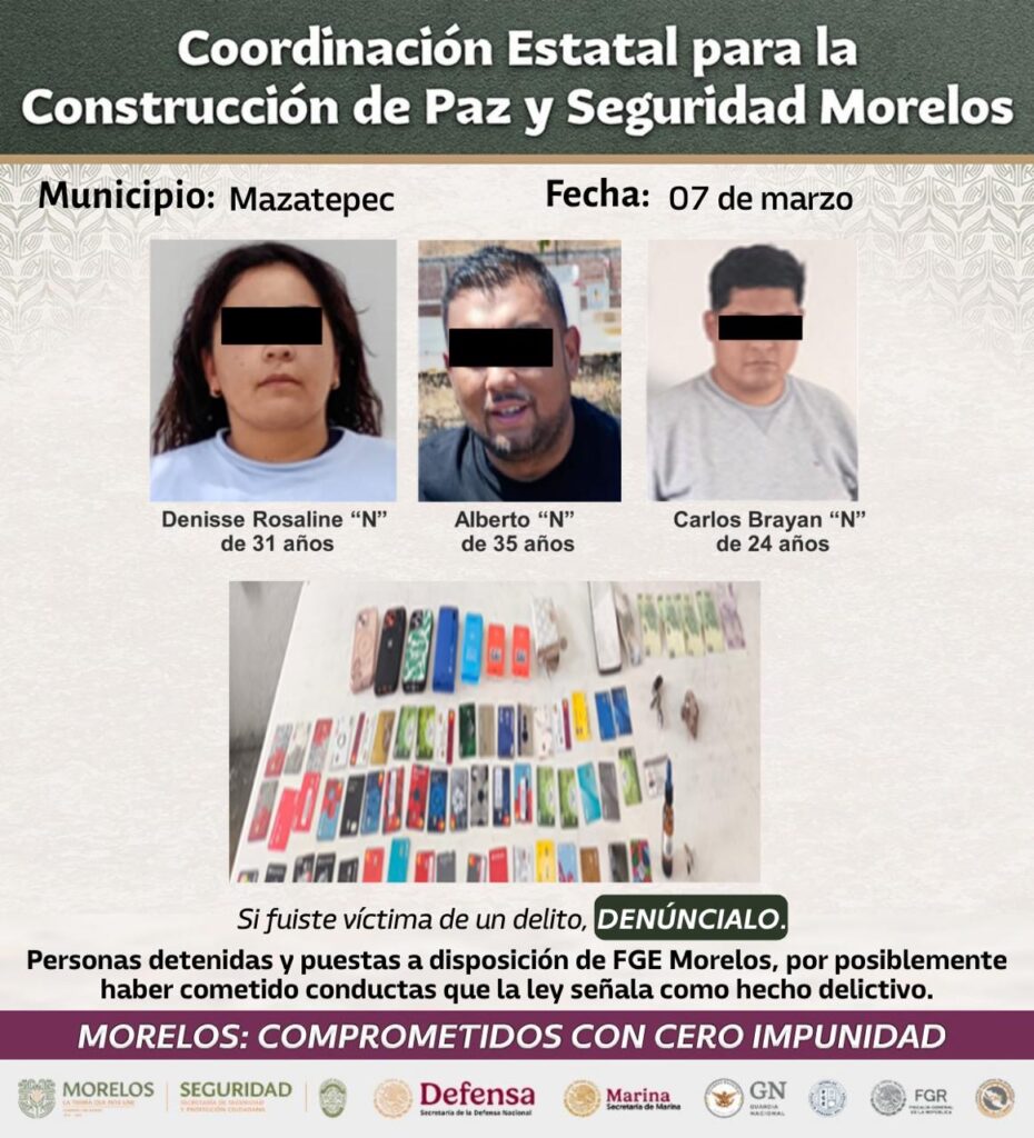 La Fiscalía General de la República, a través de la Fiscalía Especializada de Control Regional en Morelos, obtuvo la vinculación a proceso contra los tres implicados. Conforme a la Ley de Instituciones de Crédito, este delito se sanciona con penas de tres a nueve años de prisión, además de multas económicas. Las acciones forman parte de la estrategia de la Mesa Estatal para la Construcción de Paz y Seguridad para combatir delitos financieros y proteger el patrimonio de la ciudadanía.