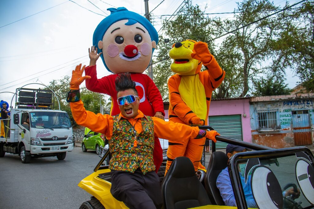El recorrido inició en Lomas del Carril y fue encabezado por el alcalde Israel Piña Labra, quien convivió con niñas y niños que recibieron dulces y participaron en el desfile.
