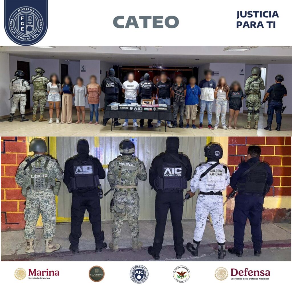 Un operativo encabezado por el Centro de Operaciones Estratégicas (COE) de la Fiscalía Regional Metropolitana permitió el cateo de un inmueble en el municipio de Jiutepec, presuntamente vinculado con la venta de drogas, donde fueron detenidas once personas.