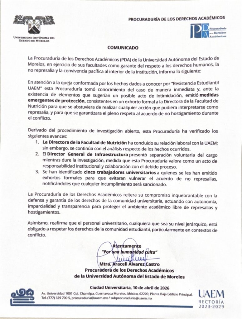 Cuernavaca, Mor. – La Procuraduría de los Derechos Académicos (PDA) de la Universidad Autónoma del Estado de Morelos (UAEM) informó que la directora de la Facultad de Nutrición concluyó su relación laboral con la institución, como parte de las investigaciones derivadas de la queja presentada por la Resistencia Estudiantil por presuntos actos de intimidación y hostigamiento en el plantel.