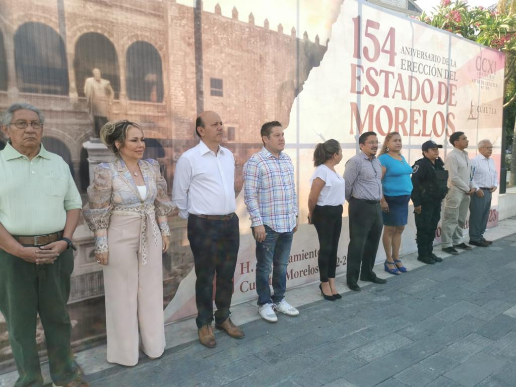 Con honores a la bandera a cargo de la Secretaría de Seguridad y Protección Ciudadana, el alcalde de Cuautla, Rodrigo Arredondo acompañado de la presidenta del SMDIF, Araceli García Garnica e integrantes del cabildo, encabezó la ceremonia conmemorativa por el 154 aniversario de la creación del Estado libre y soberano de Morelos en honor al Generalísimo Don José María Morelos, el gran héroe que realizó una de las grandes hazañas durante el Sitio de Cuautla de 1812 y Pavón en la Plaza y Fuerte de Galeana (Alameda).