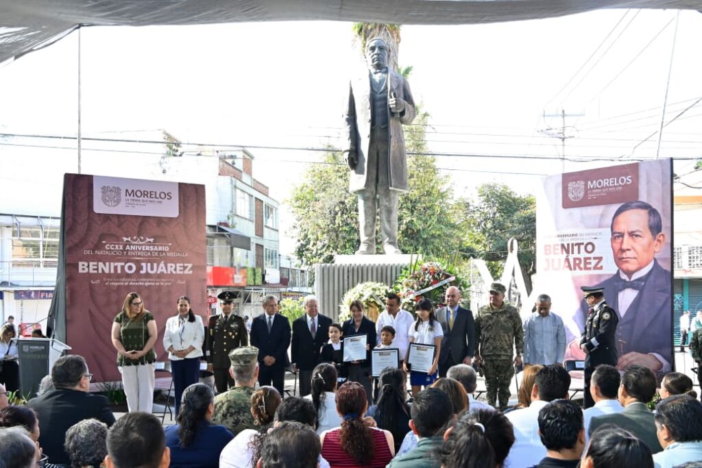 En el marco del aniversario del natalicio de Benito Juárez García, el Gobierno del Estado de Morelos llevó a cabo una ceremonia cívica y la entrega de la Medalla al Mérito Ciudadano que lleva su nombre, destacando la vigencia de los principios juaristas en la vida pública.