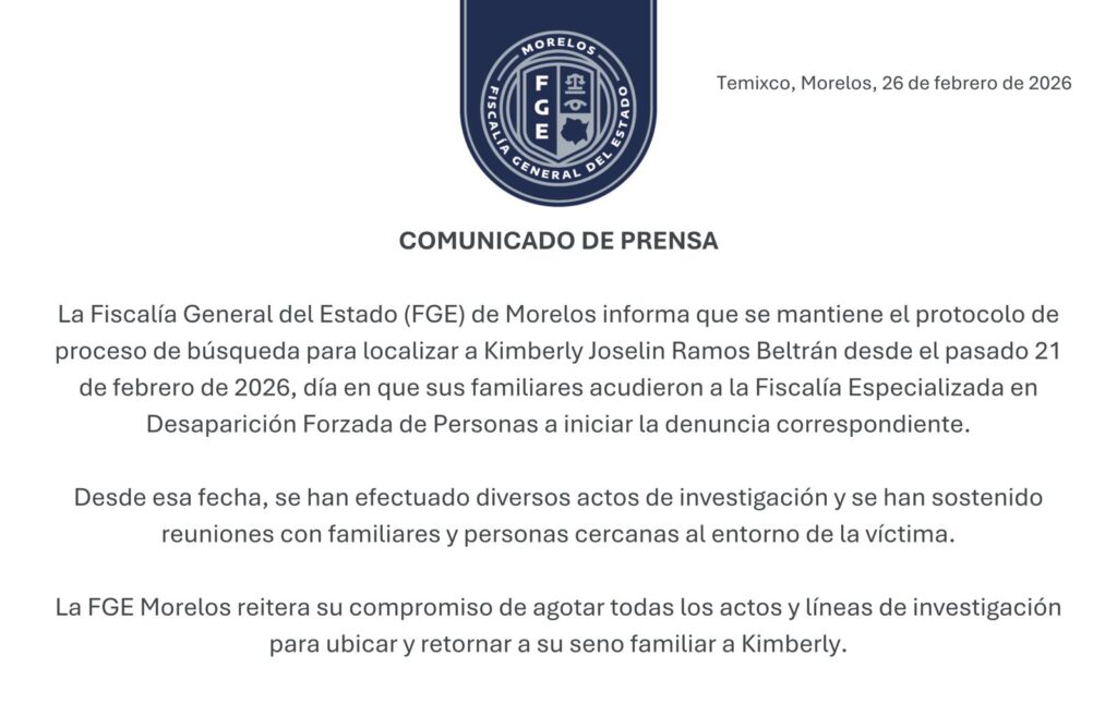Cuernavaca, Mor. – La Fiscalía General del Estado de Morelos informó que continúa activo el protocolo de búsqueda para localizar a la estudiante de la Facultad de Contaduría, Administración e Informática de la UAEM Kimberly Joselin Ramos Beltrán, reportada como desaparecida desde el 21 de febrero de 2026. De acuerdo con la institución, ese mismo día sus familiares presentaron la denuncia ante la Fiscalía Especializada en Desaparición Forzada de Personas, lo que dio inicio formal a las indagatorias.
