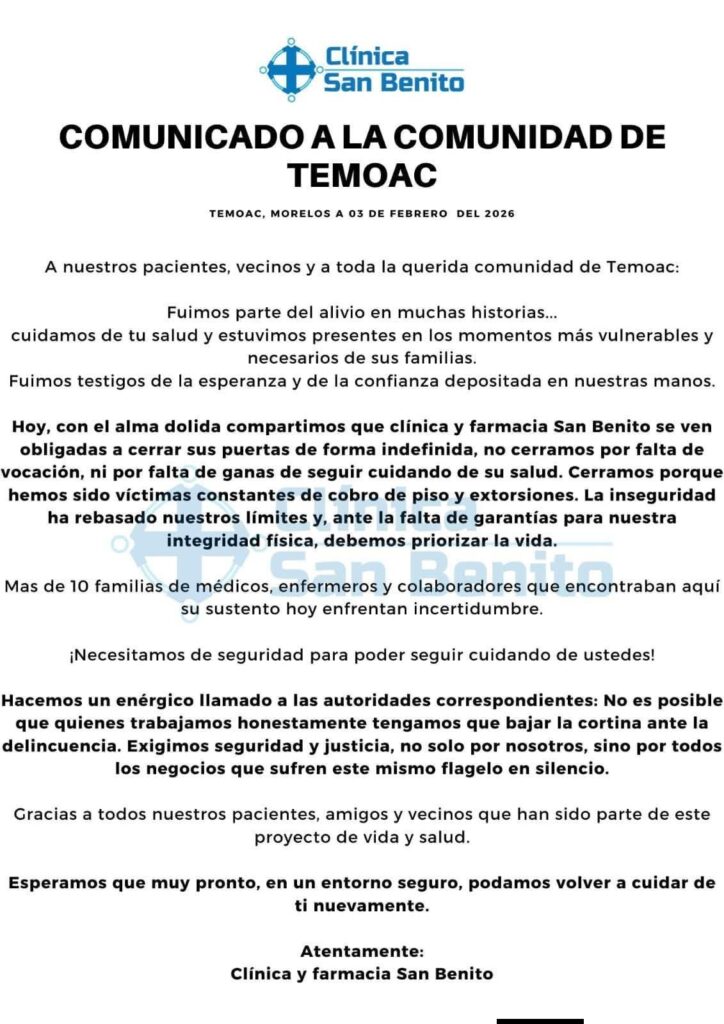 La clínica y farmacia San Benito anunció el cierre de sus instalaciones en el municipio de Temoac, tras enfrentar de manera constante actos de extorsión y cobro de piso que pusieron en riesgo la integridad de su personal y sus familias.