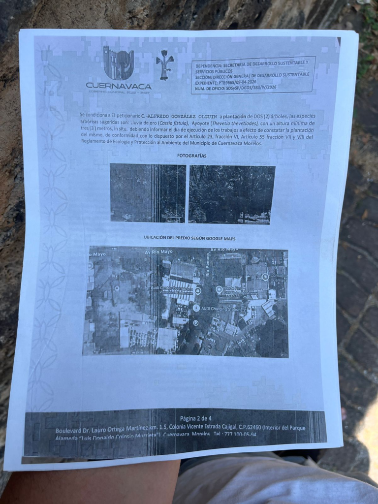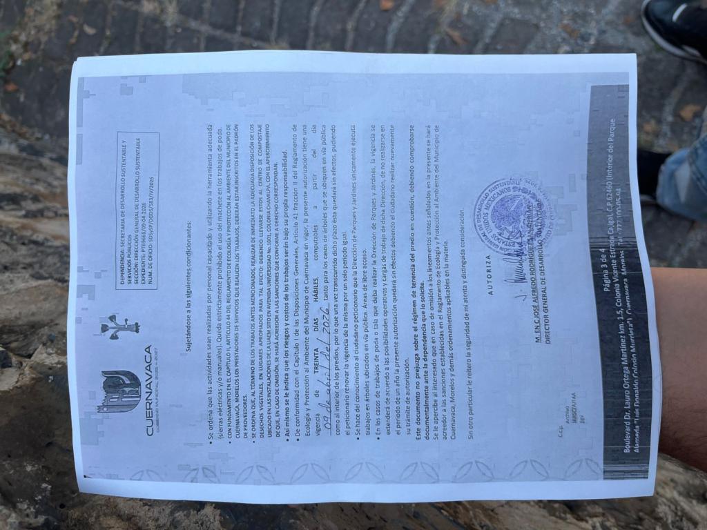 Cuernavaca, Mor. – Tras la polémica por vecinos de la colonia Vista Hermosa en Cuernavaca que reportaron la tala de árboles en la calle Río Pánuco, señalando presunta complacencia u omisión de las autoridades, fuentes confiables hicieron llegar a Punto Por Punto documentos oficiales que acreditan que la intervención fue autorizada, lo que desató un debate público y ahora coloca el foco en la reposición del arbolado.