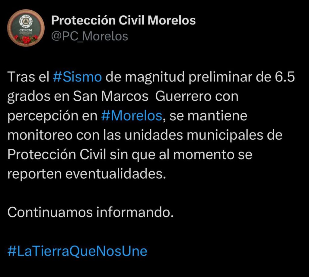 Un fuerte sismo de 6.5 grados sacudió Morelos en el segundo día de 2026. El epicentro fue en San Marcos en el estado de Guerrero y se sintió en estados como Puebla, Ciudad de México, Guerrero y Morelos.