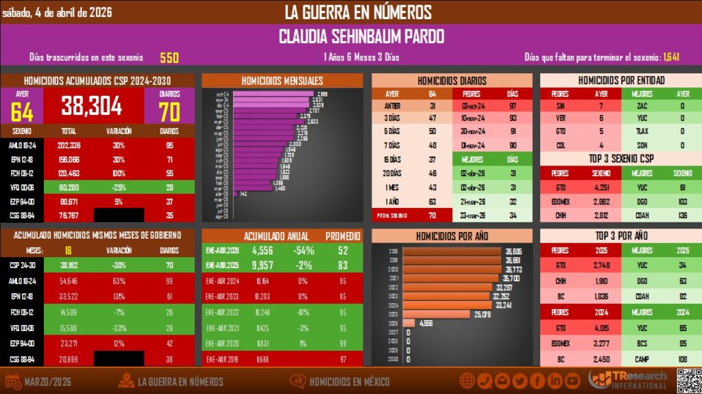 Respecto al balance acumulado del sexenio 2024-2030, se contabilizan 38 mil 304 homicidios en 550 días, manteniendo el promedio diario en 70 víctimas.