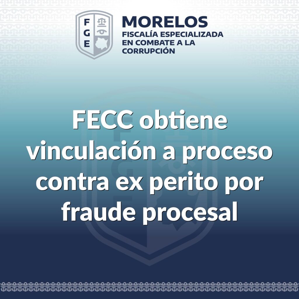 La Fiscalía Especializada en Combate a la Corrupción (FECC) informó que logró la vinculación a proceso de María del Carmen “N”, ex perito de la Fiscalía General del Estado de Morelos, señalada por su posible participación en el delito de fraude procesal. De acuerdo con las indagatorias, la ex funcionaria habría utilizado un certificado de incapacidad presuntamente falso para justificar su ausencia laboral, cobrar su salario y conservar su puesto.